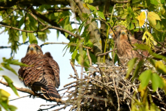 Diese jungen Turmfalken sind in einem alten Krähennest in etwa zehn Meter Höhe aufgewachsen. Der Baum steht am Rande des Wohngebietes zwischen drei Hochhäusern. Am Tag der Aufnahmen waren die ersten Falken gerade dabei, das Nest zu verlassen, die anderen trainierten ihre Flügel noch fleißig im Nest. Der erste Flugversuch eines der wahrscheinlich insgesamt vier Turmfalken endete wenige Meter entfernt an der Hausfassade, wo er sich mit erstaunlicher Kraft festklammerte. Von dort aus flog er weiter zu einer kleinen Birke, auf der er etwas länger ausruhte und danach ins Nest zurückkehrte.
