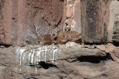 Die Burgruine Hanstein bei Bornhagen im thüringischen Eichsfeld war Ziel unseres Ausfluges am letzten Juliwochenende. Bei unserer Ankunft sah ich einen Turmfalken über der Burg fliegen und hörte auch seine Rufe. Später bei der Besichtigung der Burg konnte ich aus einem höher gelegenen Fenster das Nest in einer Nische der alten Gemäuer entdecken. Zunächst bemerkte ich nur die „Graffiti“, bevor mir nach einer Weile auffiel, dass die sehr gut getarnten jungen Falken auch noch in der Fensternische saßen. Sicher werden sie ihr Nest schon sehr bald verlassen.
